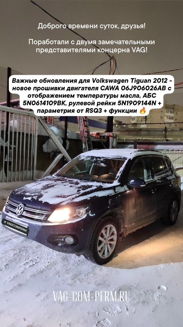 Важные обновления для Volkswagen Tiguan 2012 - новое ПО двигателя CAWA 06J906026AB с отображением температуры масла, АБС 5N0614109BK, рулевой рейки 5N1909144N + параметрия от RSQ3 + функции, Volkswagen Polo sedan 2011 восстановление кодировки блока ABS 8.2 6RU907379B.